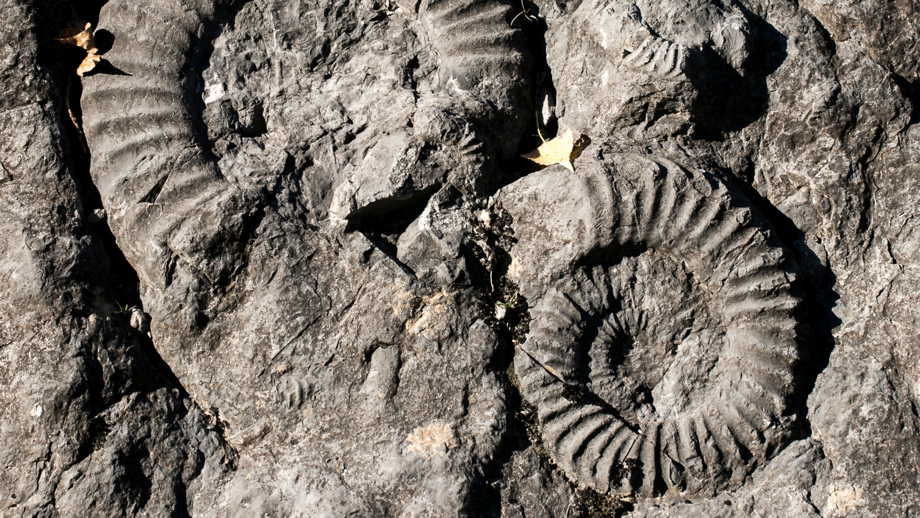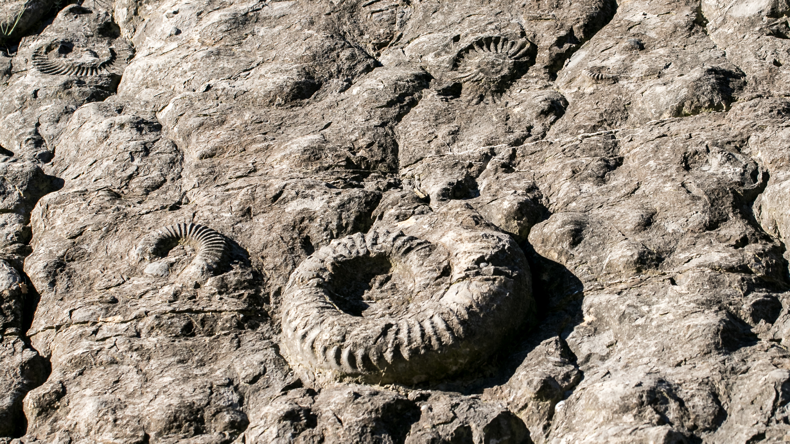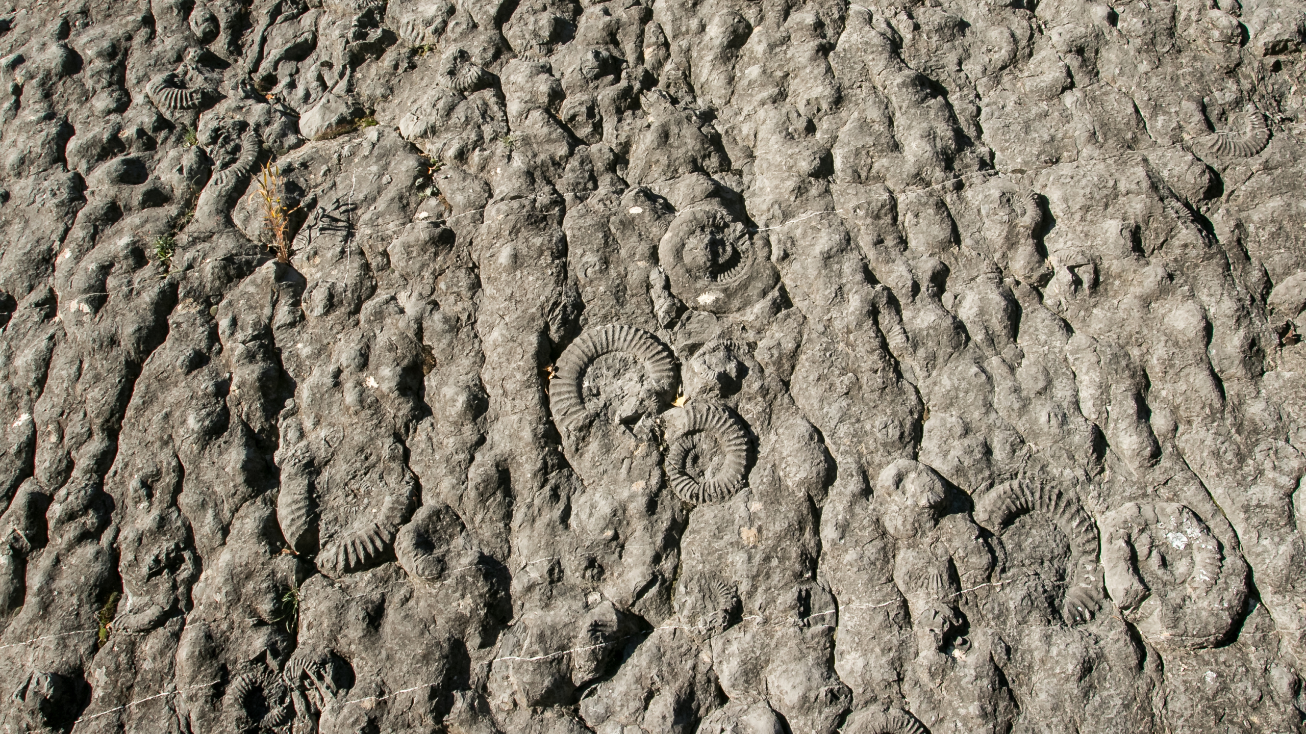 Il y a très longtemps, cette dalle était à plat au fond de la mer, et les 1550 Ammonites