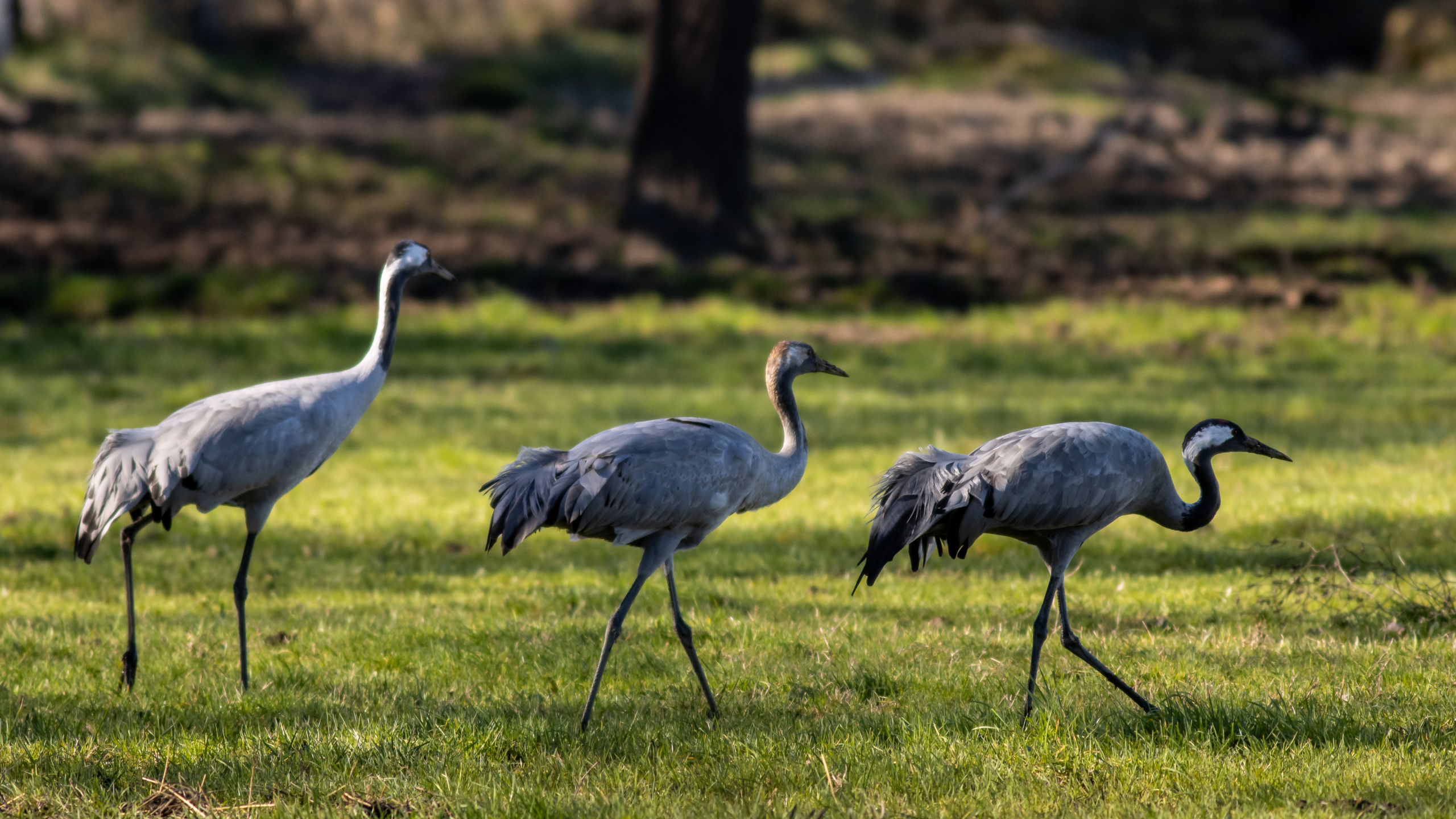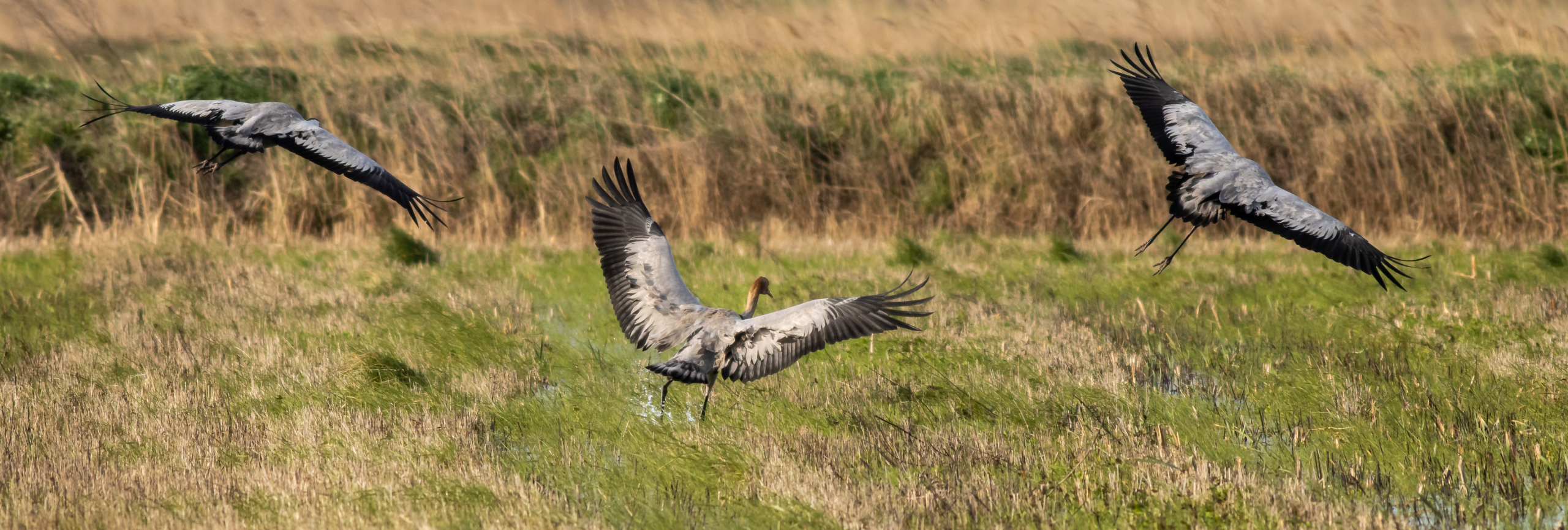 les Grues cendrées, par grandes envolées, font une courte étape dans les champs boueux,