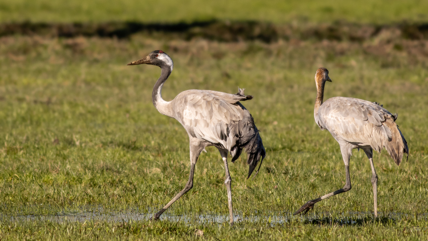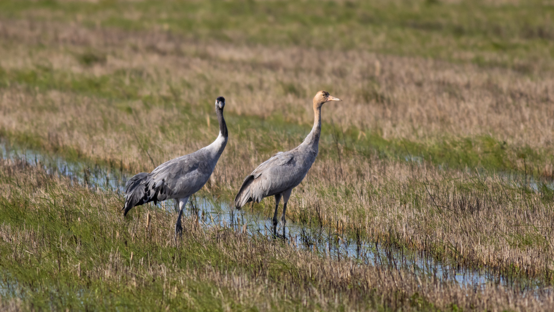 les Grues cendrées, par grandes envolées, font une courte étape dans les champs boueux,