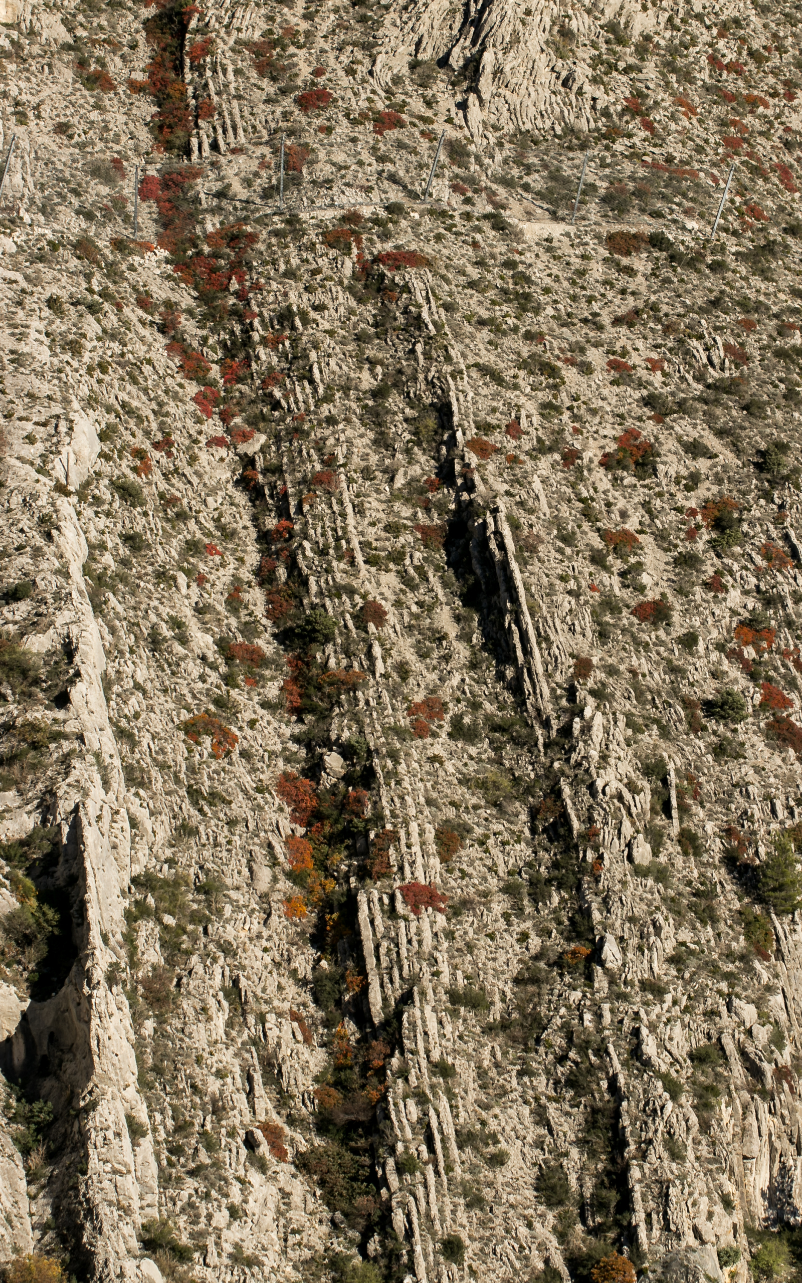 Un rocher insolite avec des barres verticales de calcaire dur,