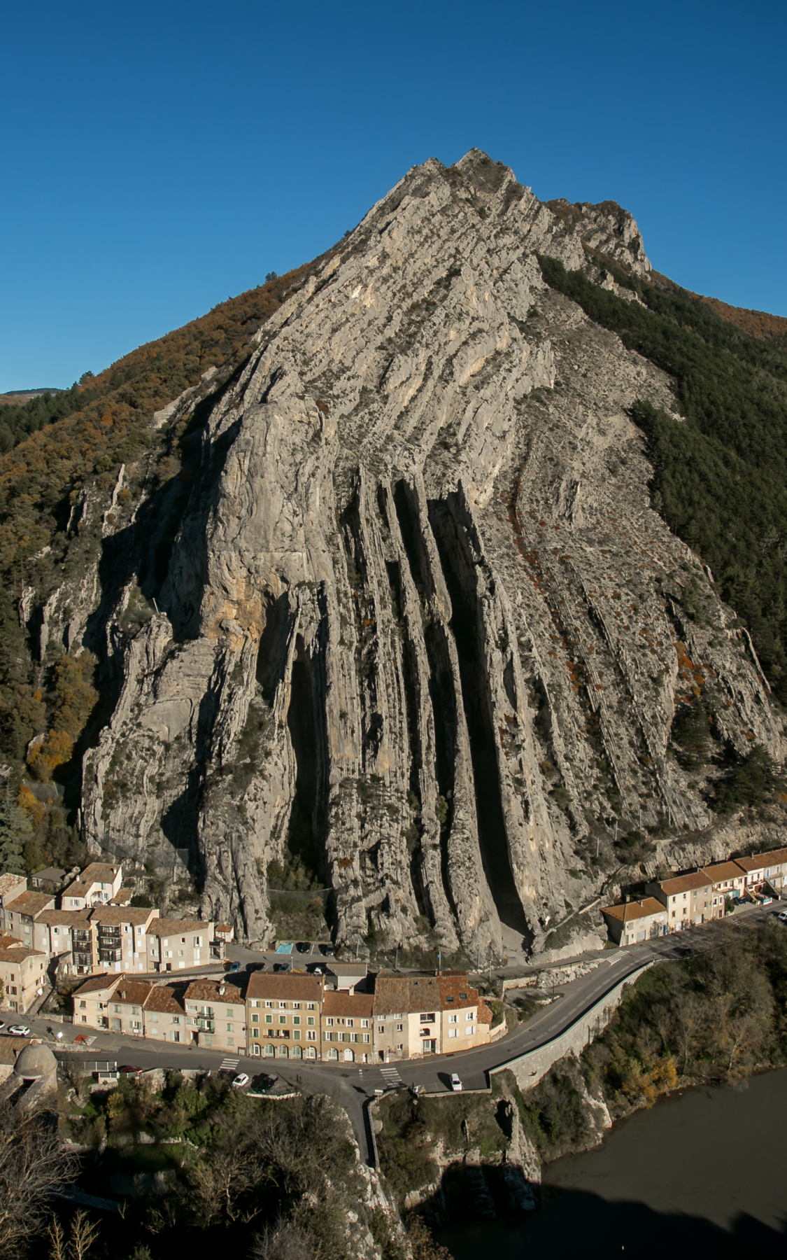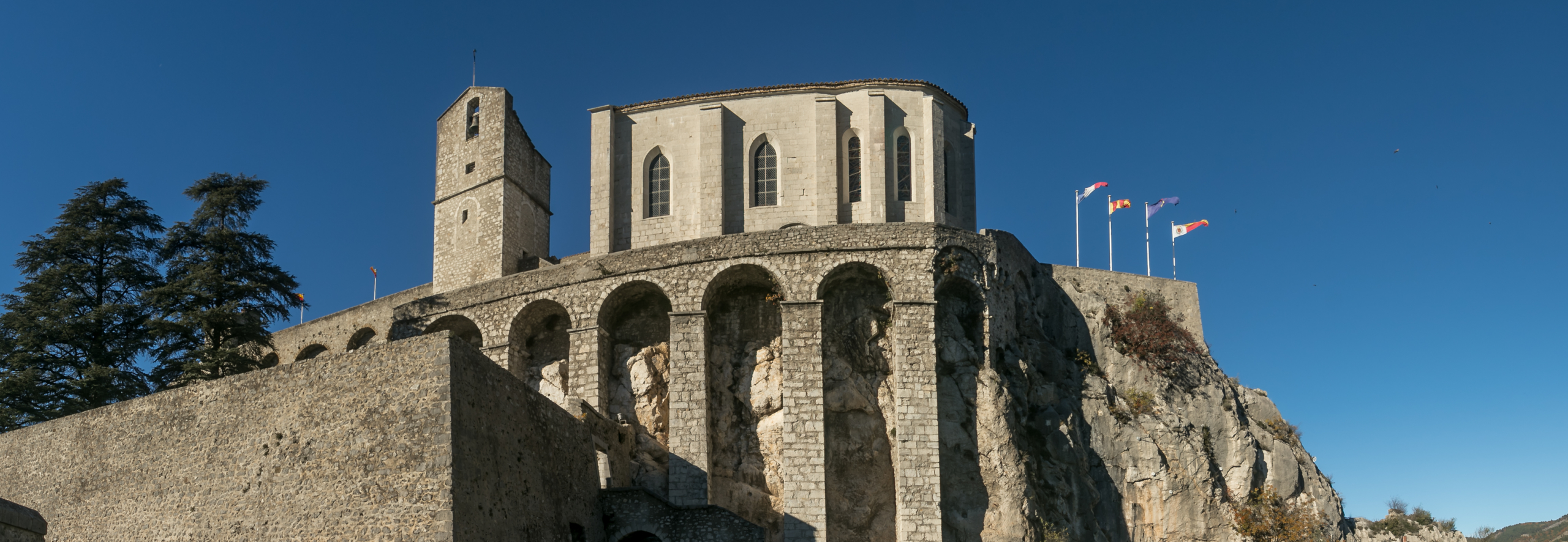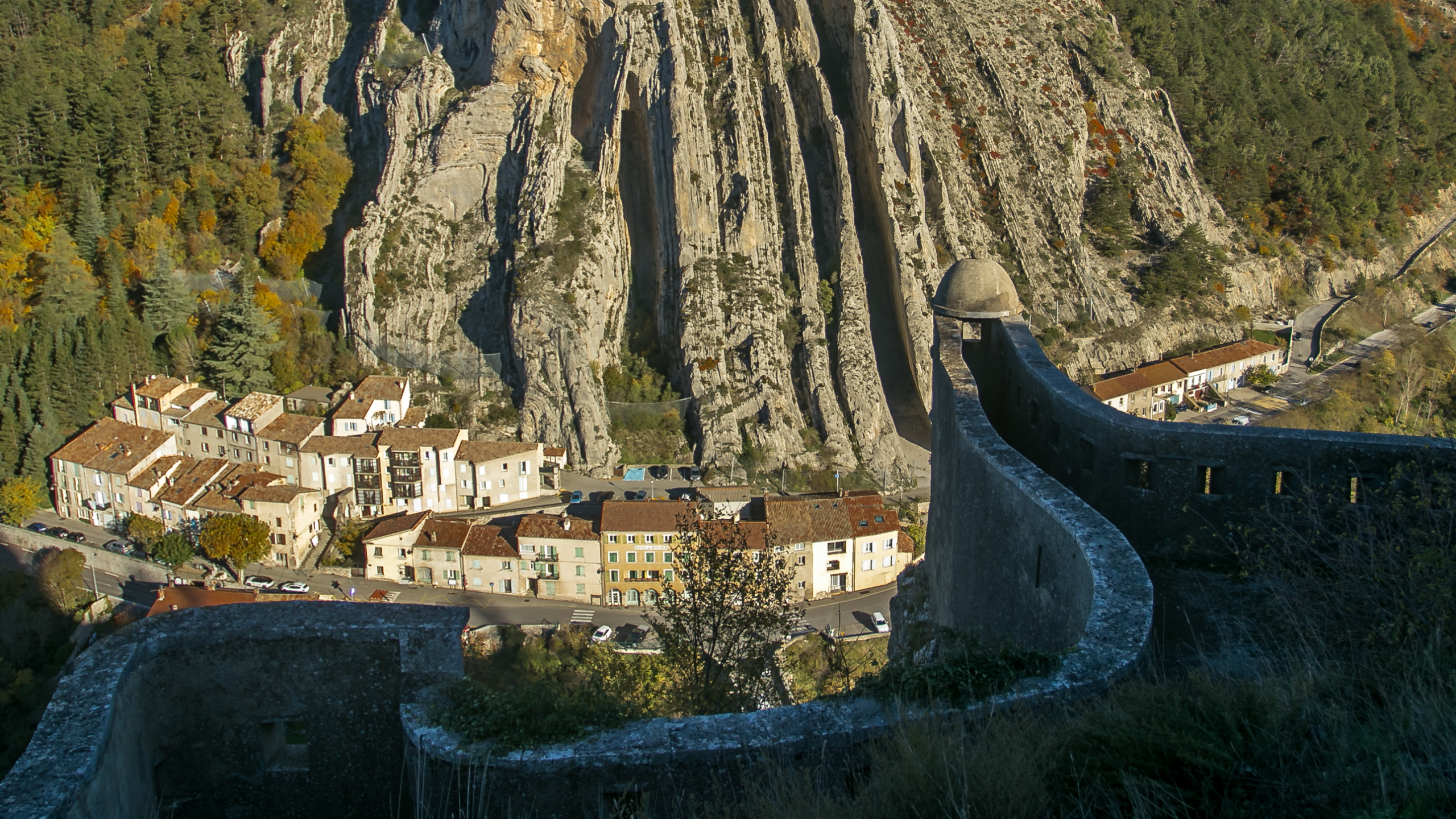 Une énorme citadelle est posée sur un rocher, qui verrouille le défilé de la Durance