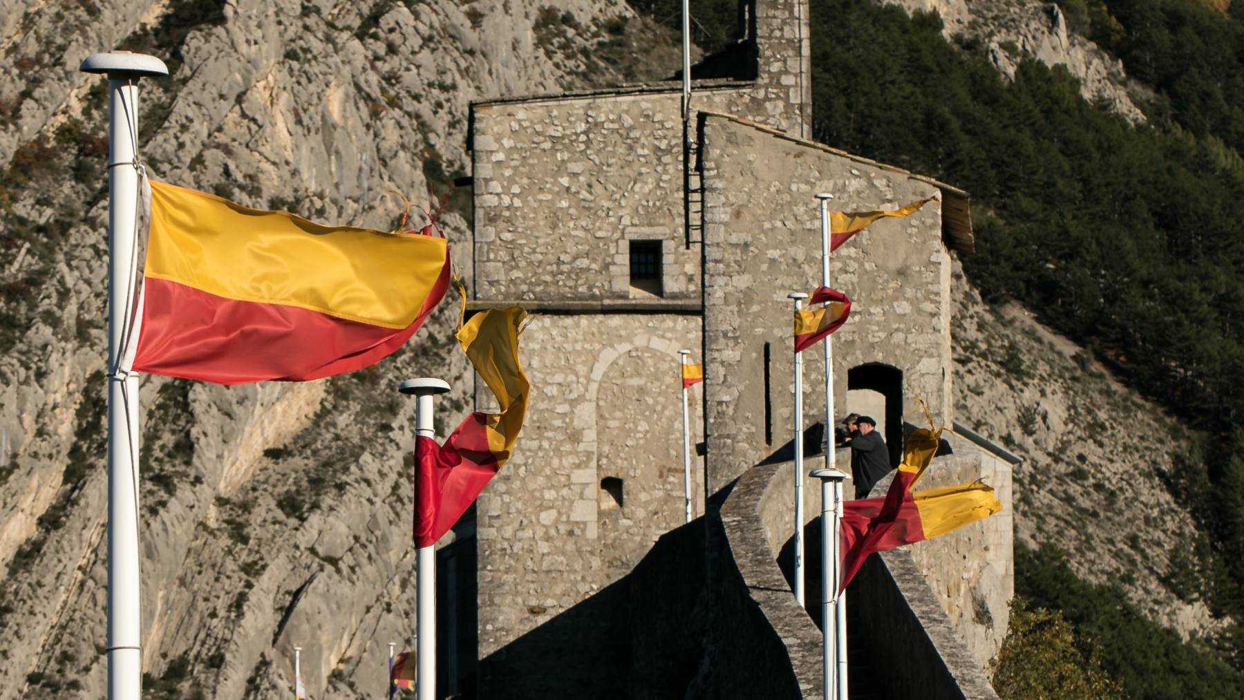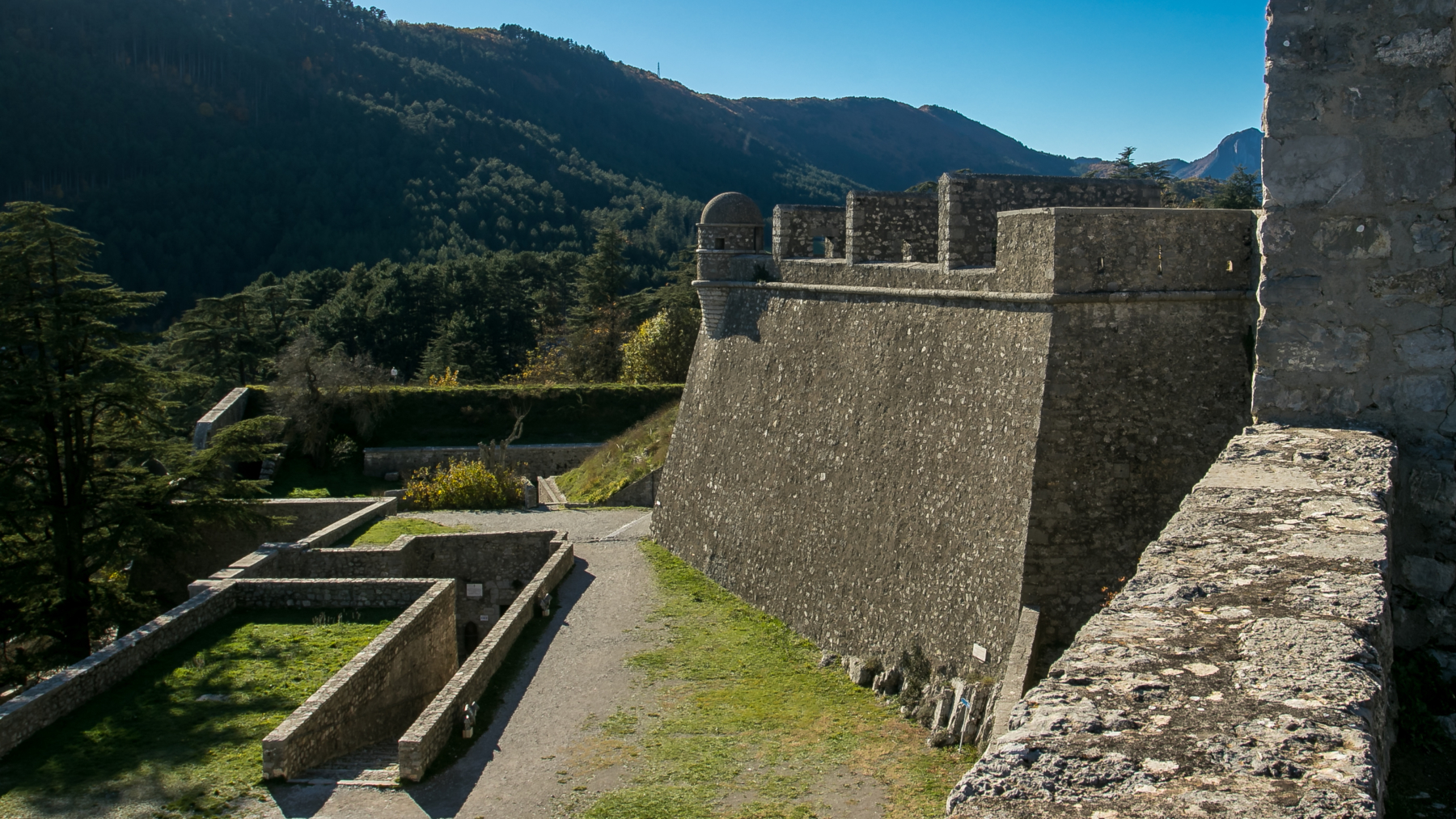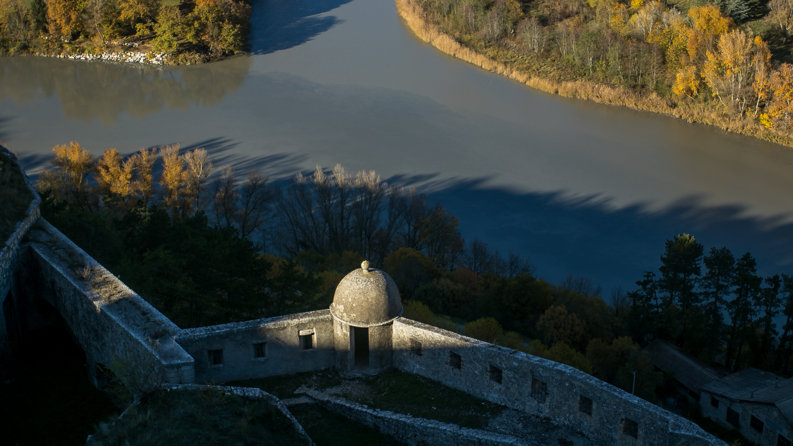 Une énorme citadelle est posée sur un rocher, qui verrouille le défilé de la Durance
